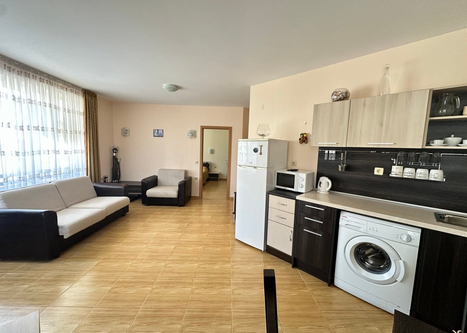 Просторная планировка: Площадь 63 м² обеспечивает комфортное жилое пространство. Квартира включает большую гостиную с кухонной зоной, полноценную изолированную спальню и террасу.