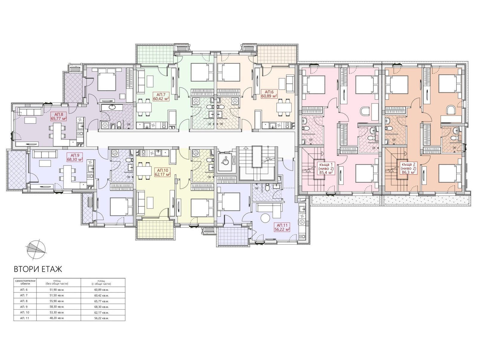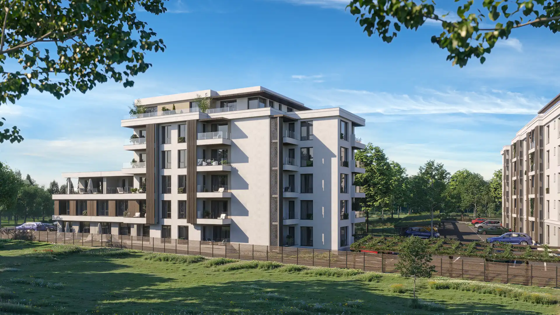 Комплекс состоит из двух 6-этажных зданий и двух трехэтажных самостоятельных домов, объединенных общей инфраструктурой. Все апартаменты сдаются «под ключ».