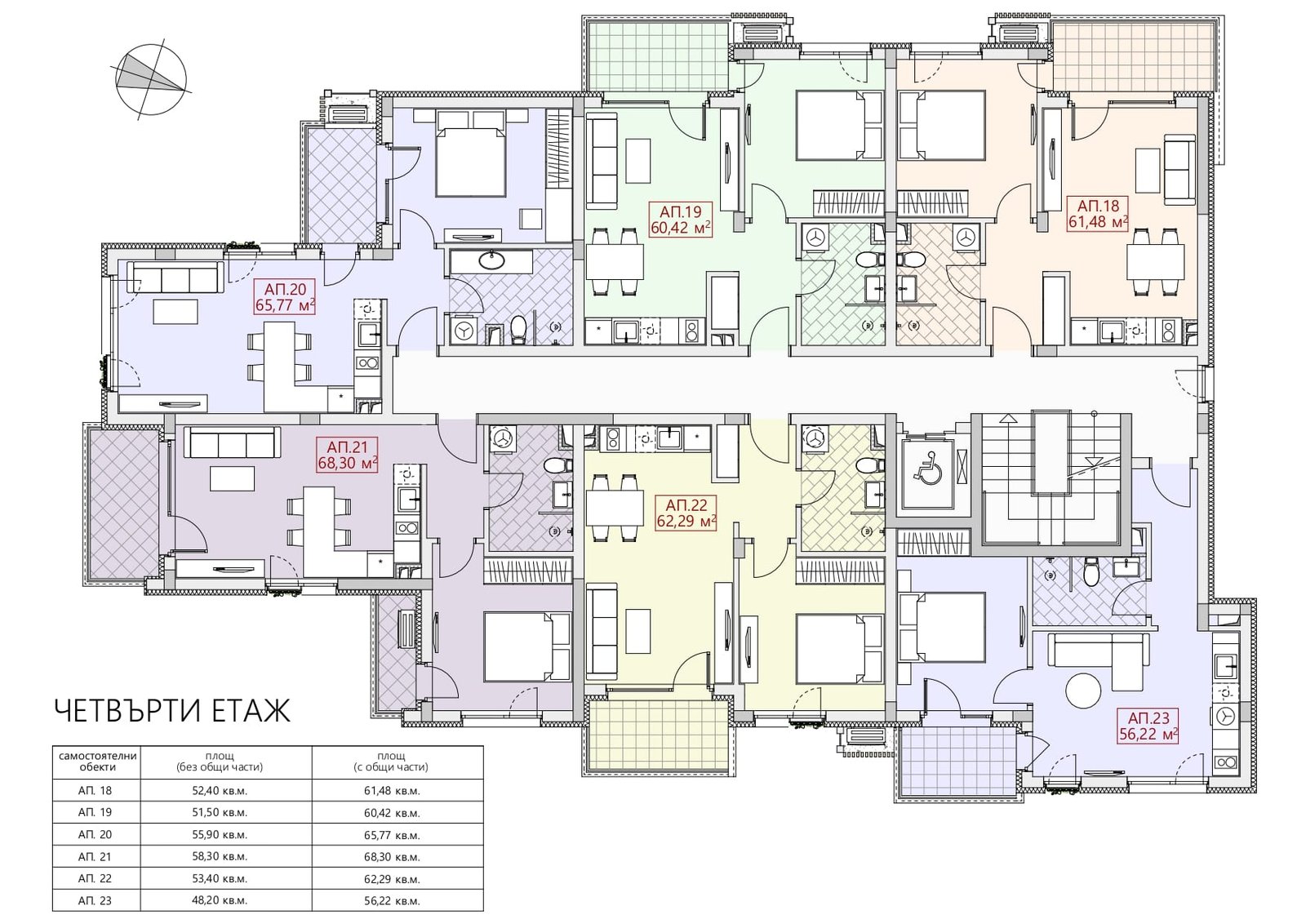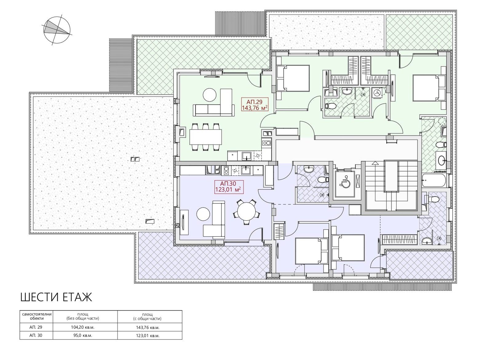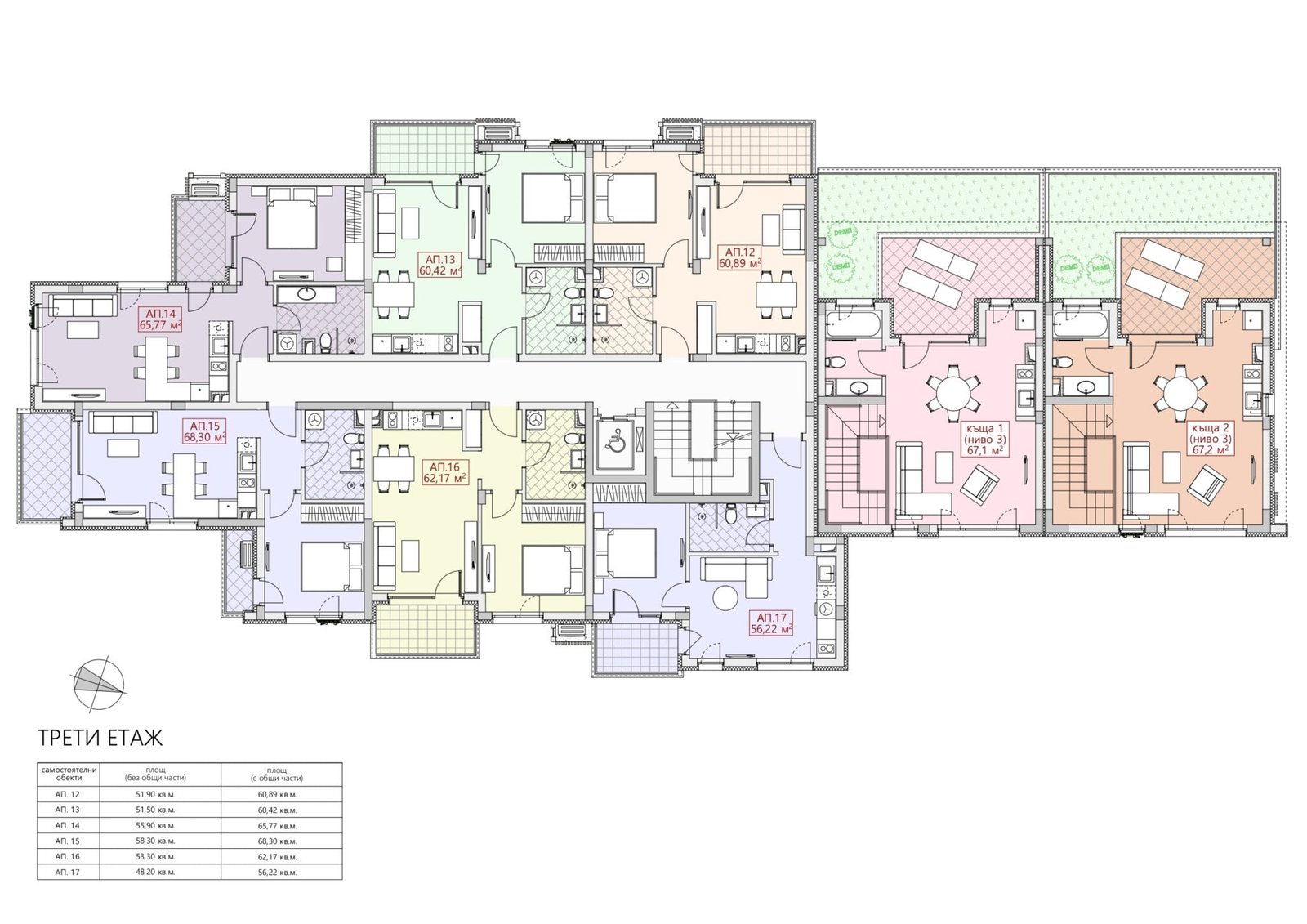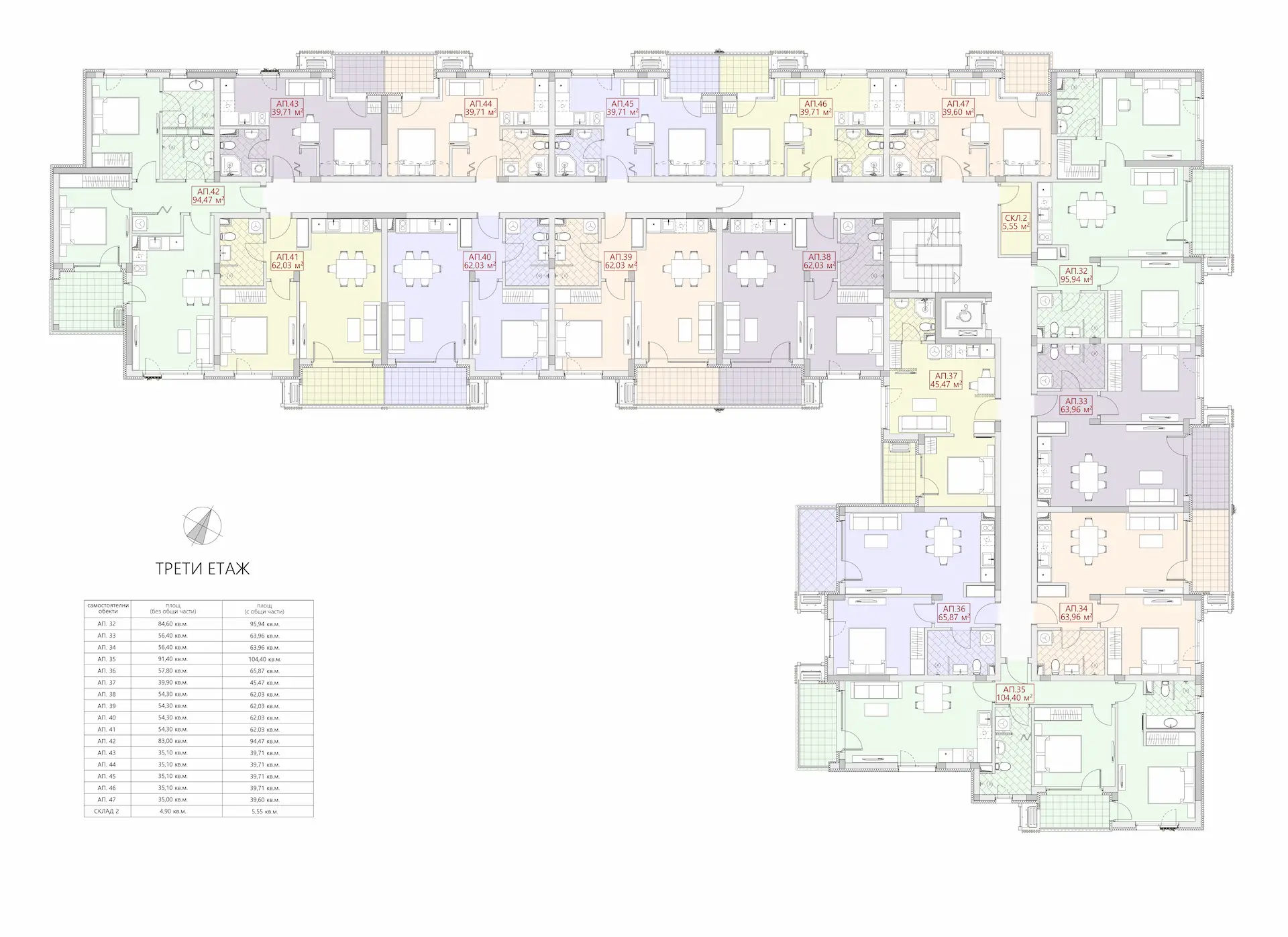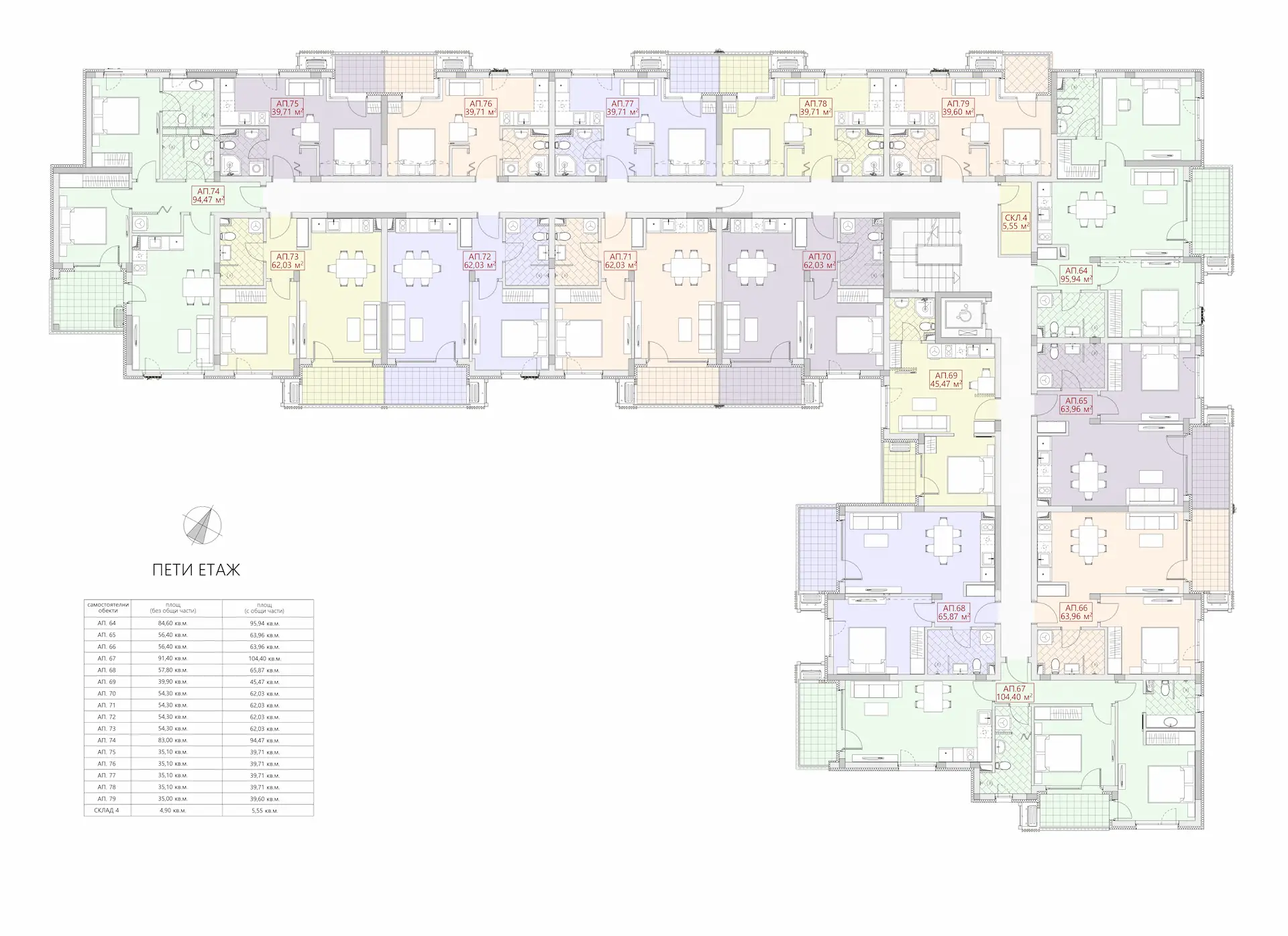 - Трехкомнатные апартаменты: от 94 кв.м. до 105 кв.м.